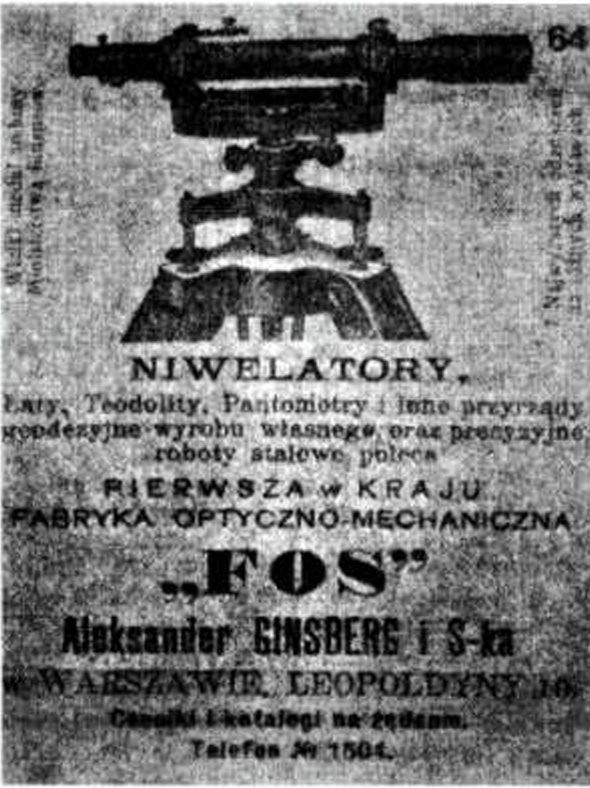 Poland's optical tradition predates its independence. While the country was partitioned between Russia, Prussia, and Austria-Hungary throughout the 19th century, several significant factories operated on Polish soil. The earliest recorded was G. Gerlach, established in 1816, which produced geodetic and drafting instruments and maintained shops in Warsaw, St. Petersburg, and Moscow. Michał Pick's optical-mechanical factory, founded in 1820, trained seventy optical mechanics from 1877 onward. Most significant was Aleksander Ginsberg's "FOS" factory, established in Warsaw in 1898 — the most dynamic optical manufacturer in the Russian Empire, producing cameras, objectives, prismatic binoculars, and military instruments before being evacuated to St. Petersburg in 1915.